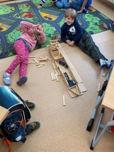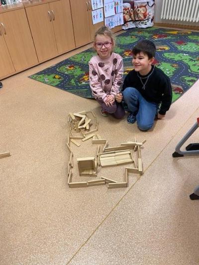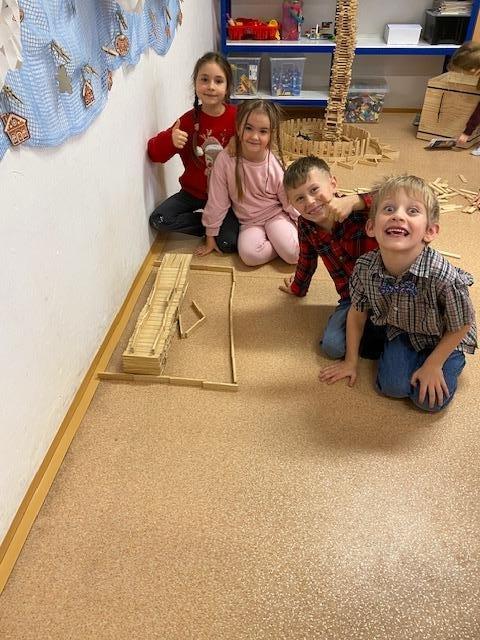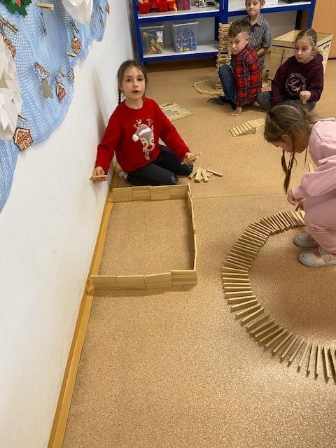Prostorovou představivost – děti přemýšlejí, jak dílky rozmístit, aby stavba držela.