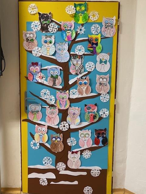 Nejprve jsme zrekonstruovali celý soví strom - modré pozadí, zem, strom. Pak nám nasněžilo a až pak jsme se pustili do papírových vloček. Ano, vím, mělo to být v opačném pořadí, ale i tak je výsledek úžasný. Mysím, že se nám to společně povedlo. Určitě se ke tvoření vloček vrátíme i s ostatními dětmi, které si to ještě nevyzkoušely.