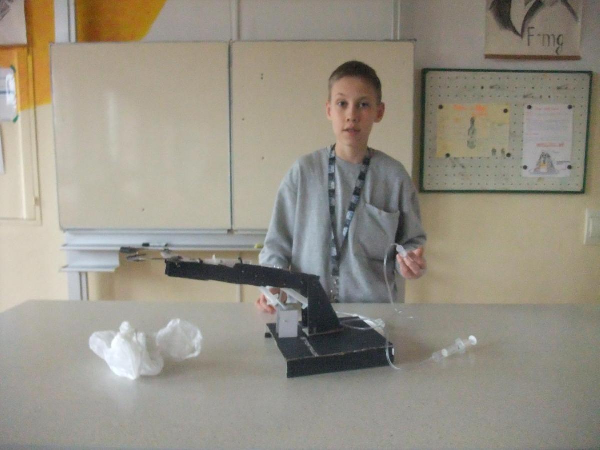 Někteří žáci 7. ročníků se aktivně zapojili do dobrovolného projektu "Hydraulická zařízení" a zhotovili funkční modely strojů využívajících přenos síly pomocí vody nebo vzduchu.